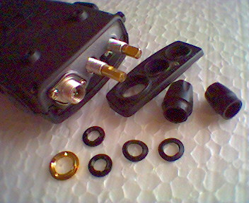 Гайка на з'єдувачі антени у моїй станції стоїть латунна, то ж має блискучо-жовтий колір і її добре видно, але гайки на регуляторі гучности і валкодері гадаю, що сталеві і мають чорне покриття схоже на пластик корпусу, то ж відразу їх і не помітиш.