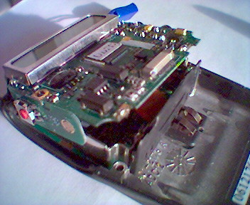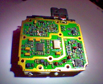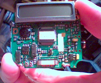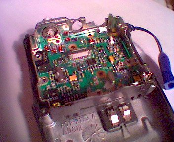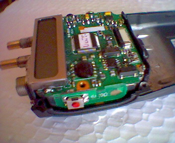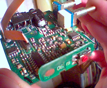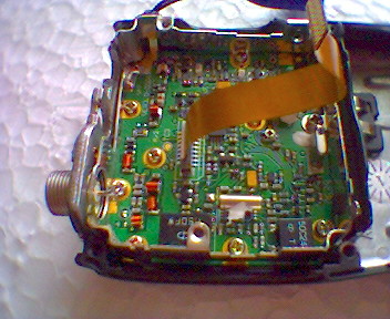 12. Від'єднуємо шлейф, який з'єднує плату контролера із платою радіотракту. Шлейф можна від'єднати на будь-якому із кінців, зрештою я від'єднав його від плати радіотракту і гадаю, що це є добрим рішенням. Шлейф затискується скобою подібно до шлейфа клавіатури, проте тут скобу треба відсувати вгору, перпендикулярно до площини плати. Плату контролера ховаємо далі у шухляду.