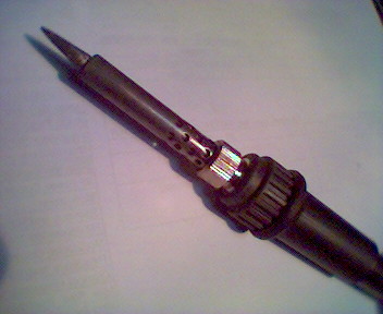 До рамки притуляється пластмасова стінка із контактами акумуляторного блоку. Щоб вберегти пластик від розпеченого заліза я вклав між рамкою і пластмасою картонну прокладку та з боку пластику підсилив захист від локальних перегрівів товстою алюмінієвою фольгою, здається від бляшанки із кавою. Гадаю, що порожні пивні бляшанки тут придатні також. NB Рештки припою можна знімати дерев'яною зубочисткою.