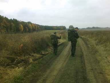 Ми рушили спершу дорогою повз село, а потім неподалік поля лісовою стежиною. Раз у раз зустрічалися ще вбрані у багрянцеві шата дерева, але жовте опале листя вже густо вкрило землю. Місяць жовтень вступив у свої права. Настала справді золота осінь. Ми бадьоро крокували лісом один за одним. Але ось із під ноги покотилася стара гільза від артелерійського набою. Вона ніби сповістила, що у цих місцях ще нещодавно господарювало військо. Що ж, це також є символічним для цієї нашої мандрівки, вона ж бо до 20-ї річниці СОУ.